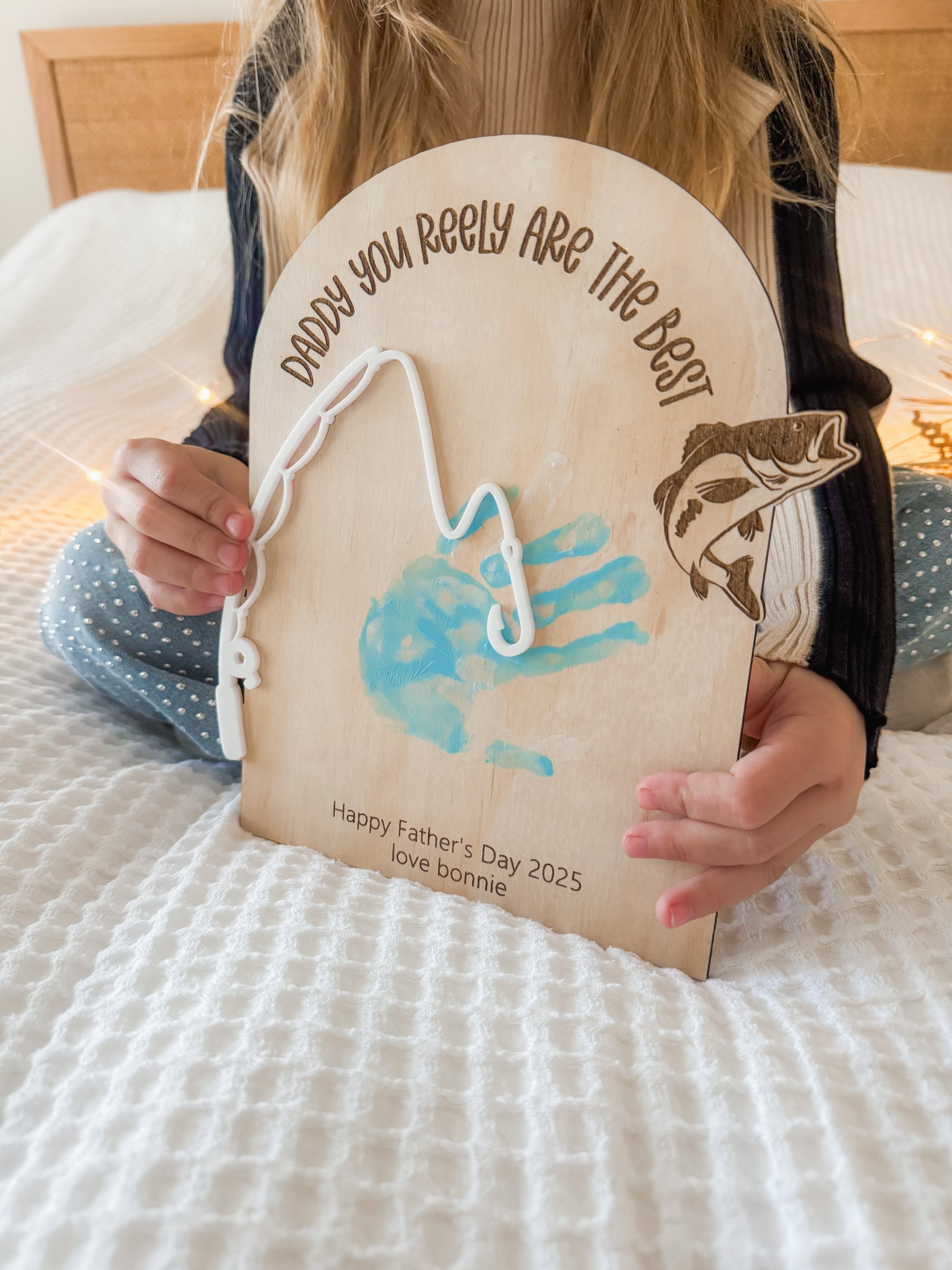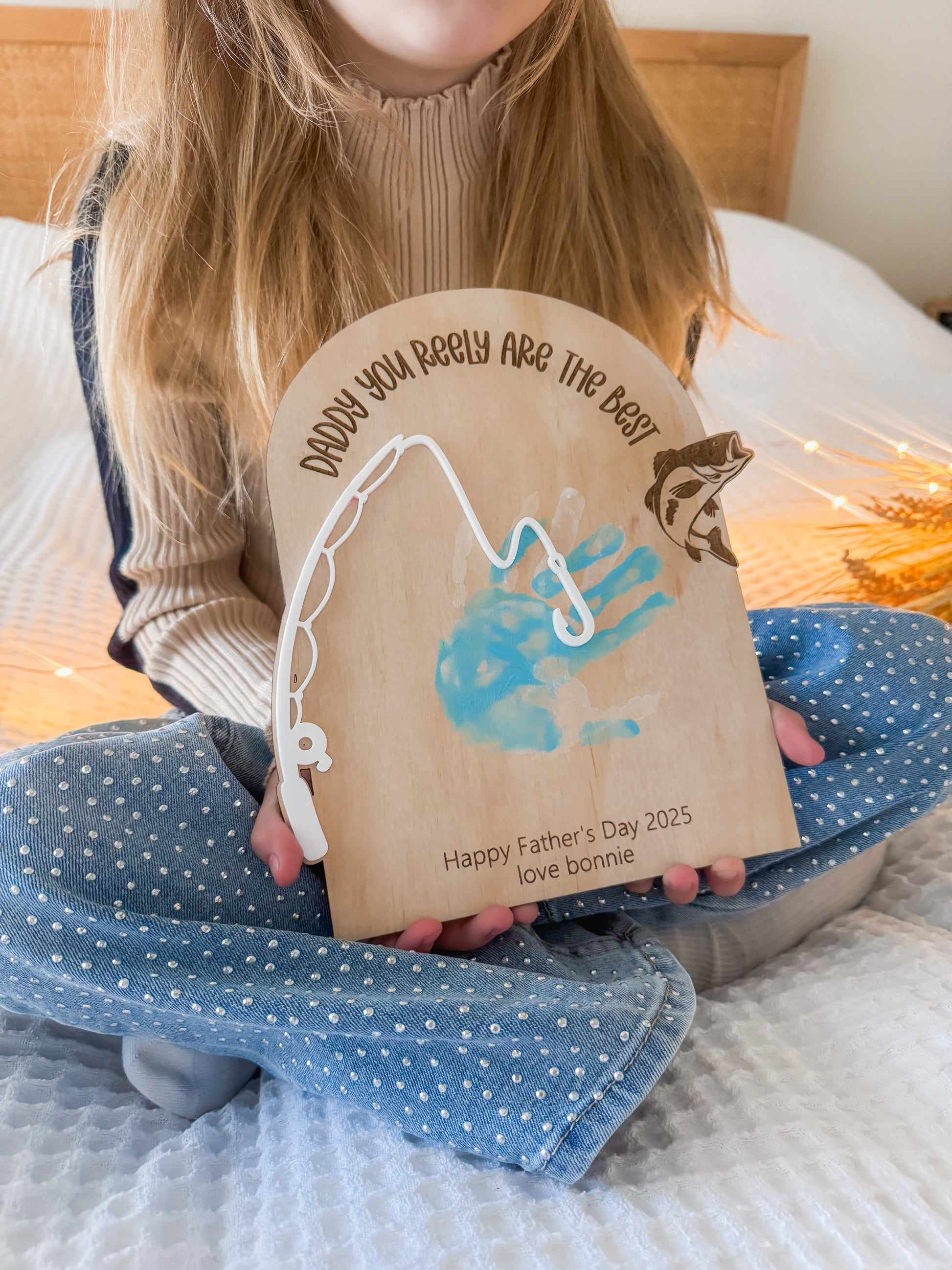 Plaque measures 30cm made on 3mm timber layered with a 3D fishing rod, that comes detached so your child/ren can put their handprints on the plaque, fishing rod comes with double sided tape on the back so it can be easily placed into position once printed on.